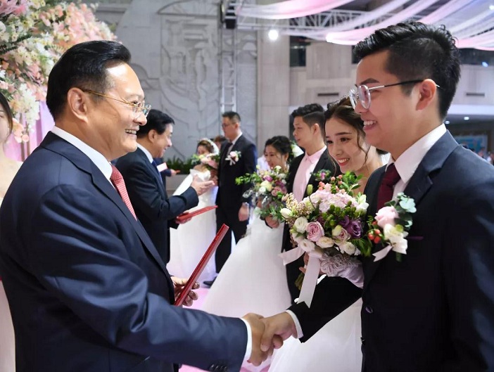 市領導張兵、劉冬生、高玲慧、孫賢龍、祝亞偉、姜波、敖考權等為新人頒發紀念證書,見證新人們人生中最甜蜜的時刻,為他們送上最美好的祝福。