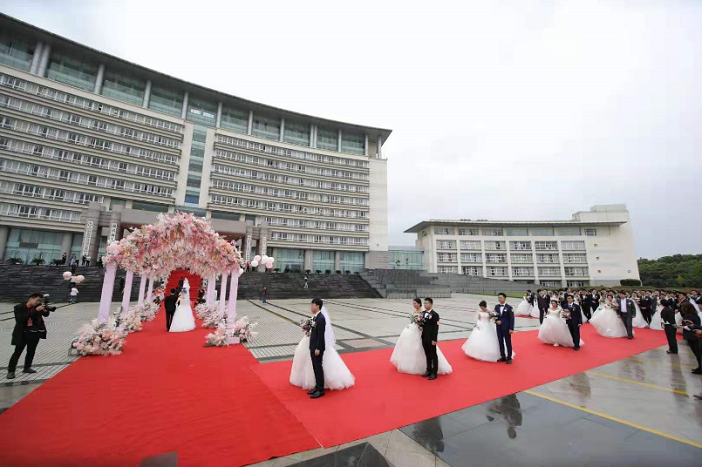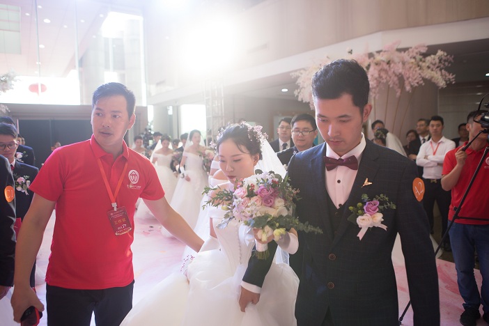 8:00,70對新人、伴娘準時到達市政府廣場。伴隨著《婚禮進行曲》,一對對新人緩緩走上紅地毯,步入市政府。