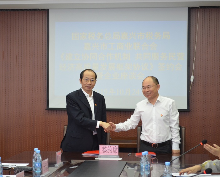 10月24日,市稅務局與市工商聯舉辦《建立協同合作機制 共同服務民營經濟高質量發展框架協議》簽約會暨民營企業家座談會。嘉興市稅務局黨委書記、局長周仕雅,嘉興市委統戰部副部長、市工商聯黨委書記張建生,嘉興市工商聯副主席顧小萍等出席會議。我市10余家民營企業參加會議。會議由市稅務局總經濟師沈劍芳主持。