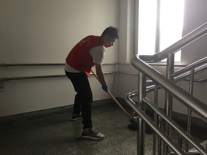 14:00,李鵬飛與支部全體年輕黨員準時來到會展中心北廣場,對會展場館東南及東北兩個樓梯進行打掃清理。李鵬飛對全體黨員進行了分工,通過劃區域包干分工,有掃地的、有拖地的,有擦欄桿的,也有搬雜物的。雖然因舉辦活動搭建場館,樓梯內垃圾多、粉塵重,但是全體黨員都沒有抱怨。經過一個下午的奮戰,黨員志愿者的身上、臉上、手上都臟了,但是場館環境煥然一新,大家內心的成就感滿滿的。