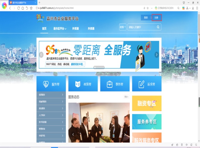 1.打開嘉興市企業(yè)服務平臺(http://jx.96871.com.cn),點擊右上角注冊按鈕。
