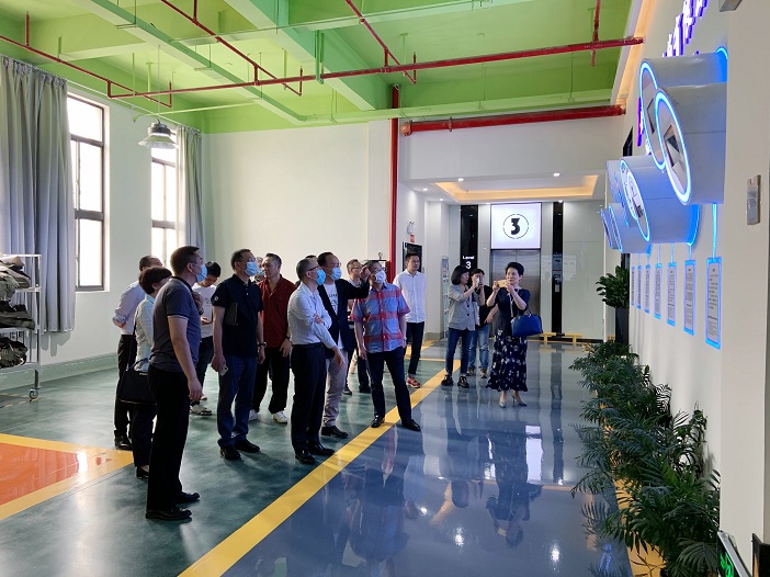 張華明一行走進恒美服飾智能工廠,參觀智能化剪裁縫制車間、倉儲車間等,現(xiàn)場詢問交流生產(chǎn)、管理、運行情況。