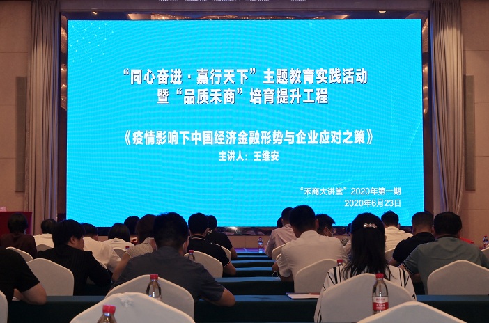 為有效推進“同心奮進·嘉行天下”主題教育實踐活動及“品質禾商”培育提升工程,6月23日下午,嘉興市工商聯主辦的首期“禾商大講堂”正式開講,浙江大學經濟學院教授、博士生導師,浙江大學金融研究所所長王維安為市工商聯執委以上企業高管、市屬商協會負責人及新生代聯誼會理事以上成員作了題為《疫情影響下的中國經濟金融形勢》的專題講座,現場反響熱烈。