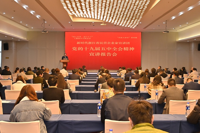 為引導(dǎo)廣大民營經(jīng)濟人士深入學(xué)習(xí)貫徹黨的十九屆五中全會精神,11月27日,新時代浙江省民營企業(yè)家宣講團來嘉興宣講黨的十九屆五中全會精神。市工商聯(lián)執(zhí)委企業(yè)代表、所屬商協(xié)會負責(zé)人,市、縣工商聯(lián)機關(guān)干部共120余人聆聽宣講報告。省工商聯(lián)黨組成員、副主席元成茂出席會議,嘉興市委統(tǒng)戰(zhàn)部副部長、市工商聯(lián)黨委書記張建生,市工商聯(lián)副主席鞠峰、秘書長王靜等參加宣講報告會。張建生主持會議。