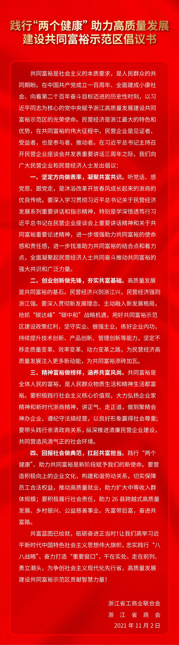 11月2日,浙江省民營經濟領域踐行“兩個健康”、助力高質量發展建設共同富裕示范區動員部署會議在杭州召開。會上,省工商聯主席、省商會會長、富通集團董事長王建沂代表省工商聯、省商會向廣大浙商發出《踐行“兩個健康” 助力高質量發展建設共同富裕示范區》倡議書。