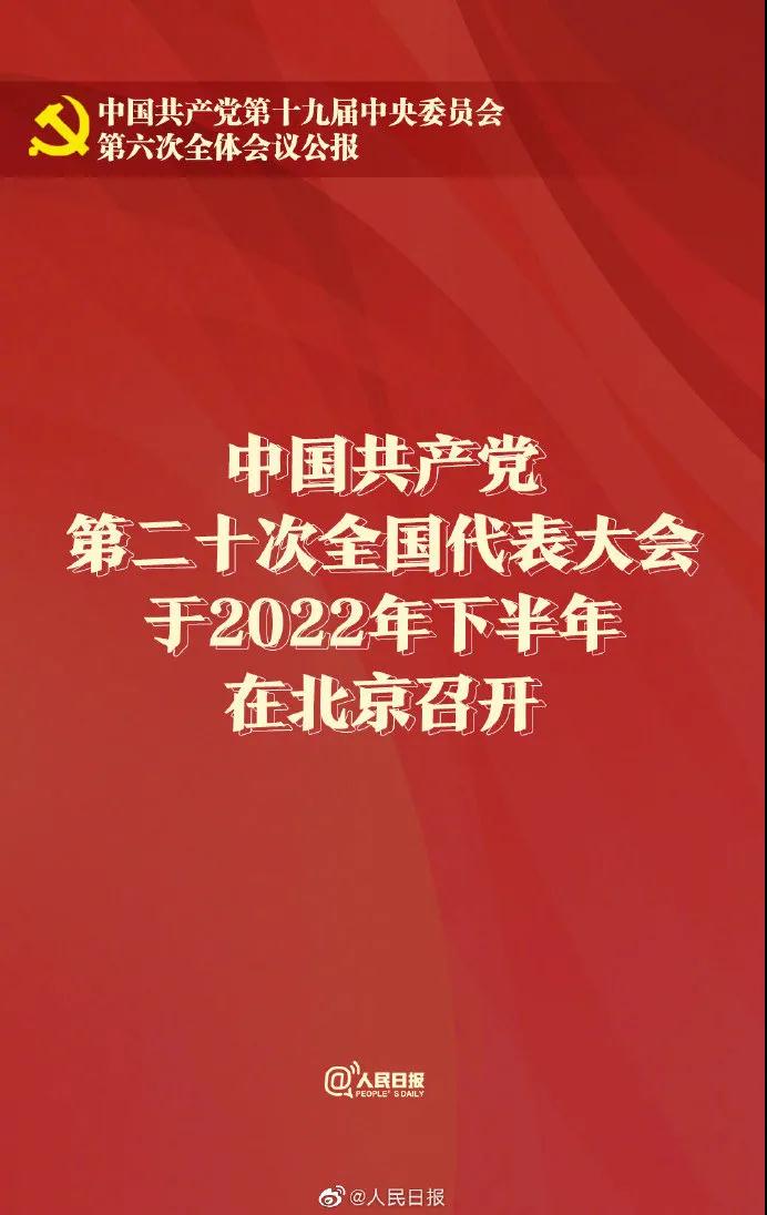 十九屆六中全會決定,中國共產黨第二十次全國代表大會于2022年下半年在北京召開。全會認為,黨的二十大是我們黨進入全面建設社會主義現代化國家、向第二個百年奮斗目標進軍新征程的重要時刻召開的一次十分重要的代表大會,是黨和國家政治生活中的一件大事。