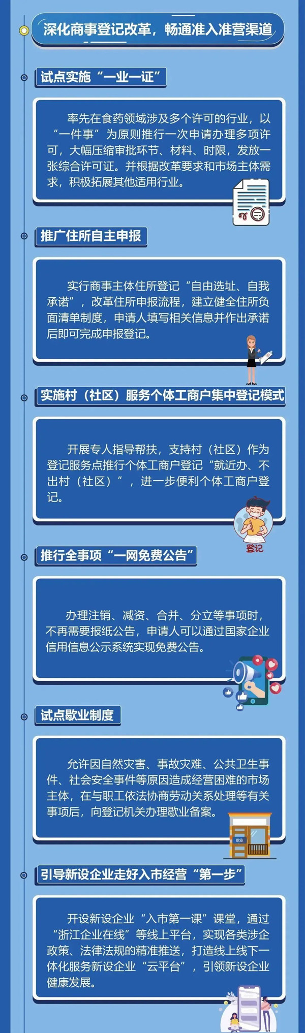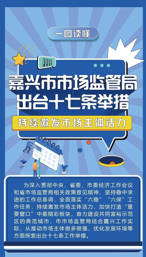 試點(diǎn)實(shí)施“一業(yè)一證”、推廣住所自主申報(bào)、試點(diǎn)歇業(yè)制度……近日,嘉興市市場監(jiān)管局出臺十七條舉措,從推動市場主體做多做強(qiáng)、優(yōu)化發(fā)展環(huán)境等方面入手,進(jìn)一步降門檻、減負(fù)擔(dān)、增補(bǔ)助、優(yōu)服務(wù),持續(xù)激發(fā)市場主體活力!笆邨l”措施包含實(shí)施多項(xiàng)試點(diǎn),凸顯改革創(chuàng)新,政策措施全面及時含金量高。