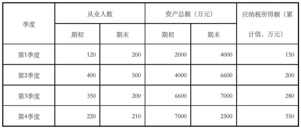 例1.A企業2020年成立,從事國家非限制和禁止行業,2022年各季度的資產總額、從業人數以及累計應納稅所得額情況如下表所示: