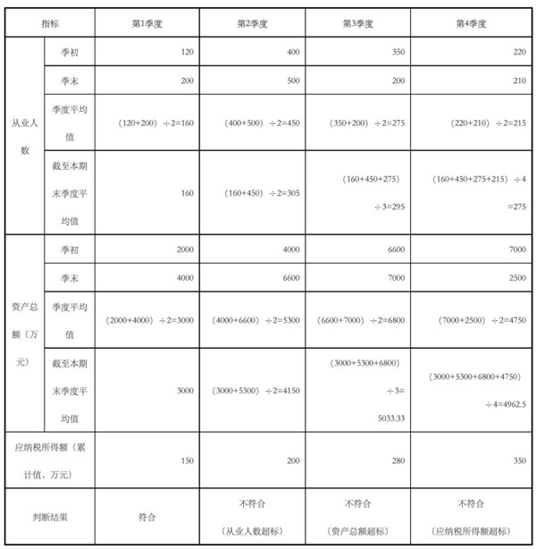 目前,小型微利企業的判斷標準為:從事國家非限制和禁止行業,且同時符合截至本期末的資產總額季度平均值不超過5000萬元、從業人數季度平均值不超過300人、應納稅所得額不超過300萬元。今后如調整標準,從其規定,計算方法以此類推。示例如下: