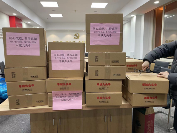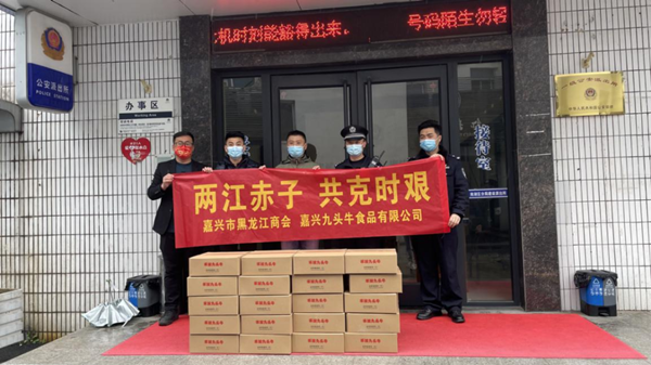 3月22日上午,由嘉興市黑龍江商會執行會長王垚淼、黨支部書記于海龍、副秘書長竇英奇代表商會會長單位浙江九頭牛餐飲管理有限公司捐贈抗疫物資。