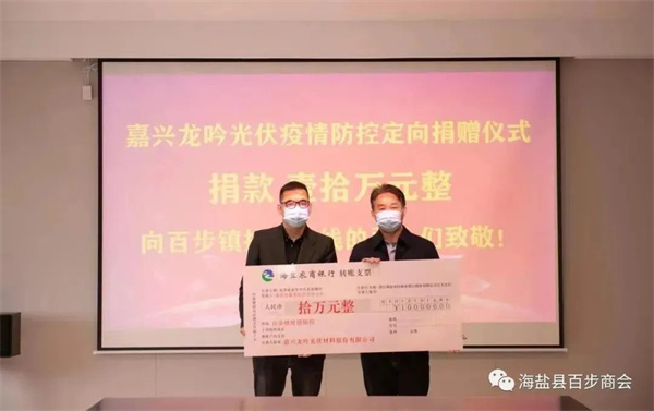 3月28日,嘉興龍吟光伏材料股份有限公司向海鹽縣慈善總會百步分會捐款10萬元,定向用于防疫抗疫,向夜以繼日奮戰在疫情防控一線的抗疫勇士表達慰問。