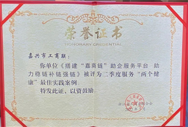 嘉興市工商聯(lián)《搭建“嘉商鏈”助企服務平臺 助力穩(wěn)鏈補鏈強鏈》獲得全省市級工商聯(lián)服務“兩個健康”最佳實踐案例!