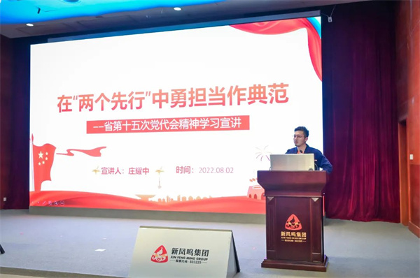 省第十五次黨代會代表、市總商會副會長、新鳳鳴集團股份有限公司董事長莊耀中作題為《在“兩個先行”中勇擔當作典范》的宣講,從黨代會的概況、黨代會的報告、黨代會的“嘉興元素”和黨代會對企業的新要求等四個方面宣傳貫徹省第十五次黨代會精神,助推企業高質量發展。