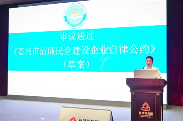 會議審議通過了《嘉興市清廉民企建設企業自律公約(草案)》,市工商聯副主席鞠峰宣讀公約內容。