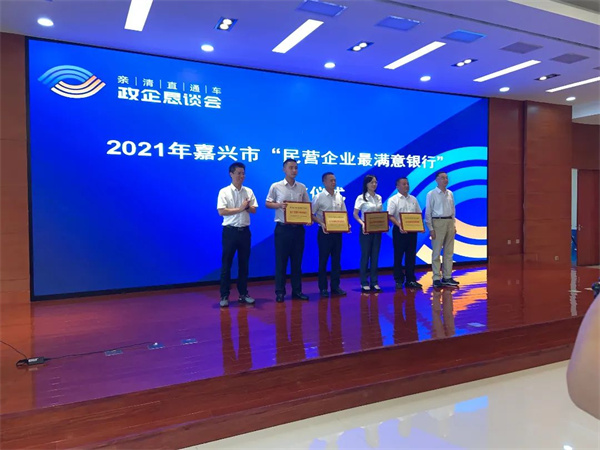 會(huì)議表彰了“萬家民企評銀行”活動(dòng)中評選出的2021年度我市“民企最滿意銀行”,湯鐘堯副行長和殷鋒副主席為工商銀行嘉興分行、農(nóng)業(yè)銀行嘉興分行、浙江禾城農(nóng)商銀行等3家市級“民營企業(yè)最滿意銀行”和嘉善農(nóng)商銀行、平湖農(nóng)商銀行、海鹽農(nóng)商銀行、海寧農(nóng)商銀行、桐鄉(xiāng)農(nóng)商銀行等5家縣級“民企最滿意銀行”進(jìn)行了現(xiàn)場頒獎(jiǎng)。