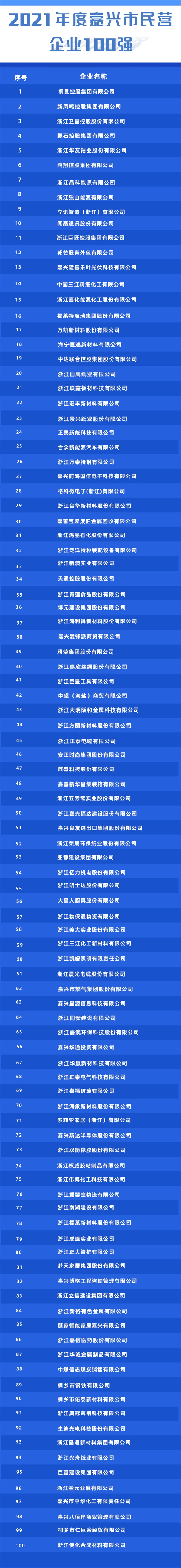 10月28日,嘉興市市場監管局、嘉興市工商聯共同發布“2021年度嘉興市民營企業營業收入100強”榜單。本次100強榜單根據企業提供的2021年度財務報表,以企業2021年度營業收入為主要依據進行排序。