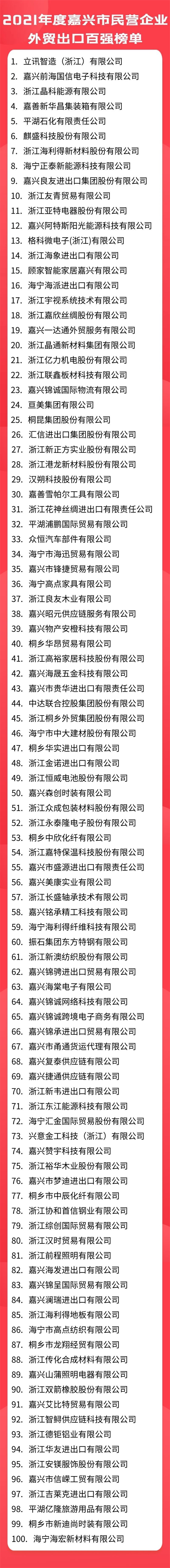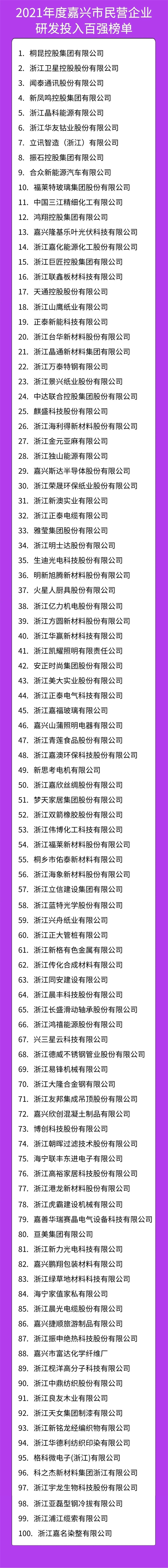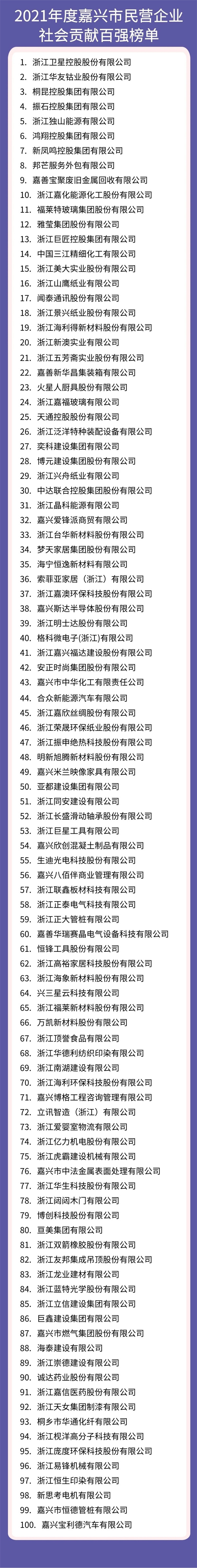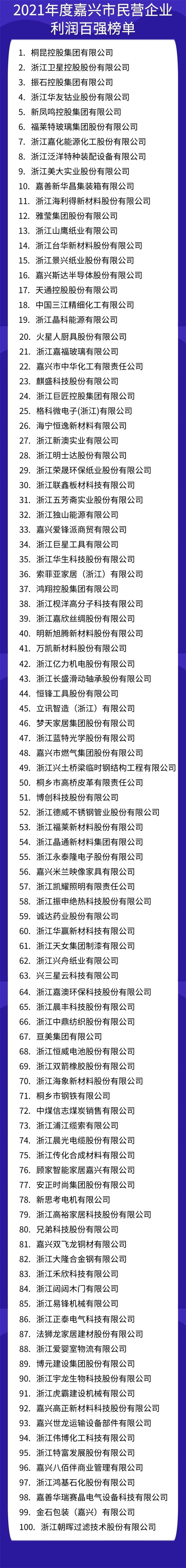 為了引導我市民營企業爭先創優、加大研發投入、提升市場競爭力,提升社會貢獻度,10月31日,嘉興市工商聯發布“2021年度嘉興市民營企業利潤100強、研發投入100強、外貿出口100強和社會貢獻100強”四份榜單。榜單根據企業提供的2021年度財務報表以及相關單位的數據為主要依據進行排序。