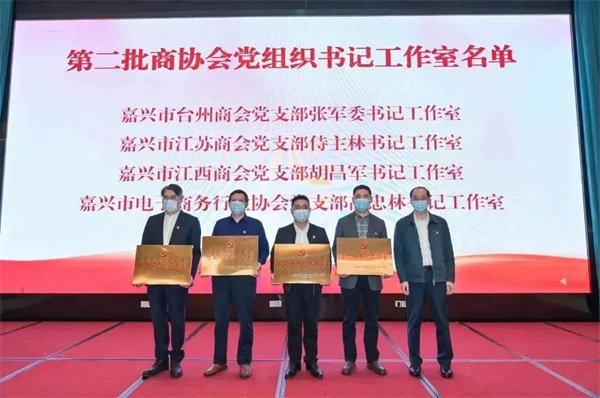 會上還對嘉興市臺州商會黨支部張軍委書記工作室、嘉興市江蘇商會黨支部侍主林書記工作室、嘉興市江西商會黨支部胡昌軍書記工作室、嘉興市電子商務行業協會黨支部高忠林書記工作室等四家第二批商協會黨組織書記工作室進行了授牌。