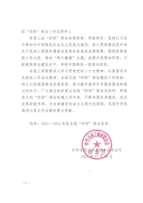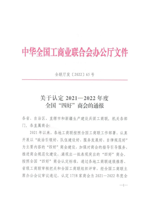 日前,全國工商聯認定并公布2021-2022年度全國“四好”商會名單,嘉興市山東商會、嘉興市湖南商會、嘉興市福建商會、嘉興市電子商務促進會、秀洲區王店集成裝飾(頂墻)協會、嘉善縣大云鎮商會、平湖物業服務行業商會、海寧市新生代創業聯誼會、桐鄉市電子商務行業協會等9家商會榮獲全國“四好”商會稱號。截止目前,我市獲得全國“四好”商會榮譽的商會已達19家。