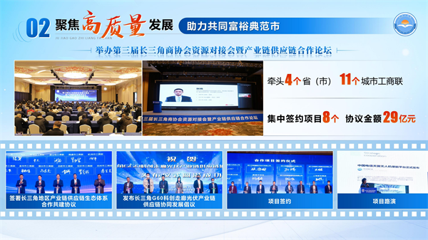 牽頭4個省(市)11個城市工商聯,在線下線上聯合舉辦第三屆長三角商協會資源對接會暨產業鏈供應鏈合作論壇,以“聚商強鏈,生態共贏”為主題,簽署長三角地區產業鏈供應鏈生態體系合作共建協議、發出長三角G60科創走廊光伏產業鏈供應鏈協同發展倡議,在打通產業鏈、穩定產業鏈、延伸產業鏈,實現產業共同發展等方面,找到新的合作路徑。會上,生命健康基金、高端數字化制藥裝備建設等8個項目進行了集中簽約,協議金額達29億元,發布了200余家長三角民營企業的供需信息,華為技術有限公司、浙江清華柔性電子技術研究院等26家單位進行了現場和云上項目路演。