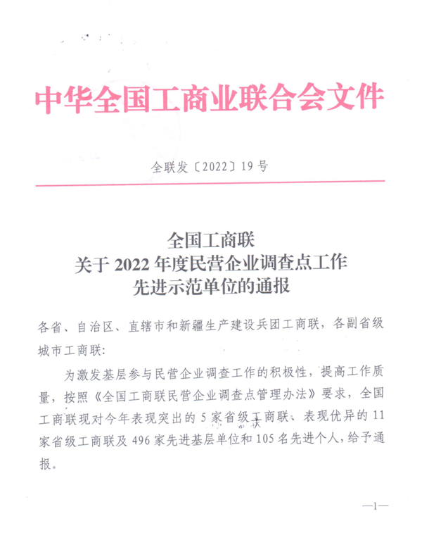 12月27日,全國工商聯印發《關于2022年度民營企業調查點工作先進示范單位的通報》(全聯發〔2022〕19號),嘉興市工商聯、平湖市工商聯、海鹽縣工商聯、桐鄉市工商聯獲評全國工商聯2022年度民營企業調查點工作先進基層單位。