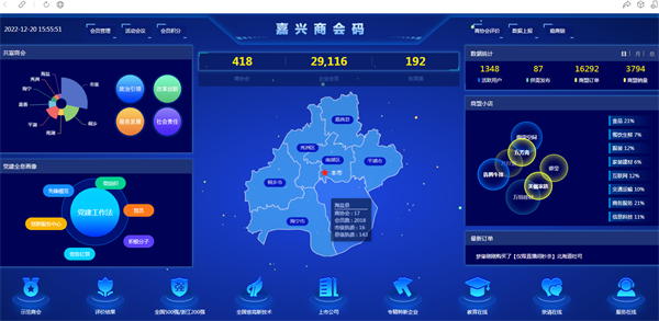 2.數(shù)字賦能商協(xié)會建設。積極探索信息化條件下開展黨建工作的新載體新路數(shù),建設運行了商會碼數(shù)字平臺,采集抓取所屬商協(xié)會黨組織和黨員基本信息,搭建學習教育和典型宣傳、志愿服務等可視化平臺,精準化實施商協(xié)會黨組織和黨員的教育、管理和考核。在數(shù)字黨建系統(tǒng)的助力下,黨建工作與業(yè)務工作的融合更加有力。近年來,市工商聯(lián)堅持數(shù)字化改革實戰(zhàn)應用,不斷迭代升級數(shù)字商會建設總體架構,深入推進商會資源對接合作等多跨應用建設,創(chuàng)新“嘉商鏈”等一批子場景,提供供需信息對接、金融產(chǎn)品服務、人力資源方案、物流服務項目、惠企政策推送等,協(xié)調(diào)解決企業(yè)產(chǎn)業(yè)鏈供應鏈中斷、資源暫時性短缺、信息不對稱等難題,加快構建以數(shù)字商會改革引領“兩個健康”的全鏈條服務體系。全國工商聯(lián)黨組書記徐樂江專門批示:“嘉興市工商聯(lián)利用數(shù)字化平臺‘商會碼’服務民營經(jīng)濟‘兩個健康’工作有創(chuàng)新之處,值得跟蹤總結”。截止目前,累計服務商協(xié)會425家、會員企業(yè)34800余家。平臺活躍用戶2.8萬余家,發(fā)布各類供需信息21480條,促成訂單26.87萬份,交易額超3.2億元。