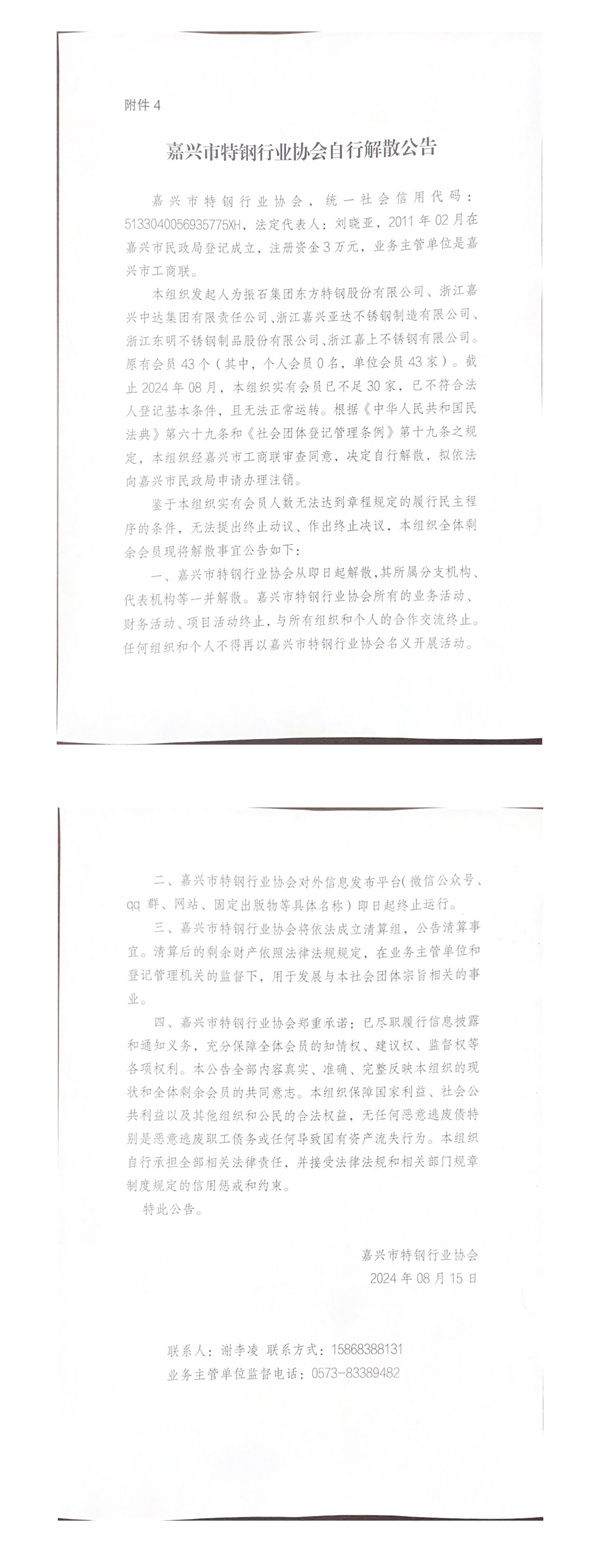 根據《嘉興市民政局關于印發<嘉興市優化社會團體退出機制試點工作方案>的通知》(嘉政民社〔2024〕45號)文件的有關規定,嘉興市特鋼行業協會因故無法按照正常程序注銷,經審查,該協會符合注銷登記特殊情形處置,由市工商聯代為發布《嘉興市特鋼行業協會自行解散公告》,同時附《嘉興市特鋼行業協會登記證書正、副本、公章、財務專用章和法人章(劉曉亞)遺失登報公告》。公告期為 20 個工作日,自2024年8月19日-2024年9月13日。監督電話:0573-83389482。