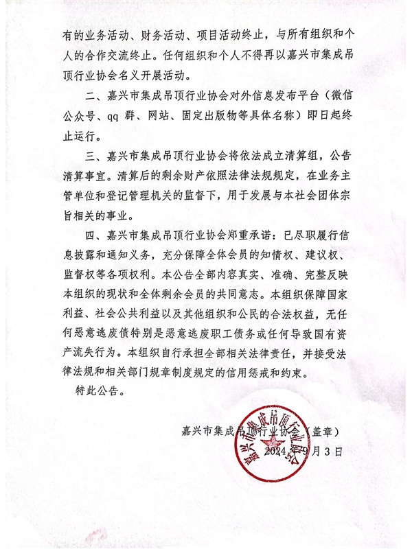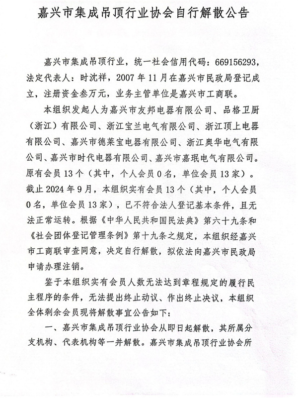 根據《嘉興市民政局關于印發<嘉興市優化社會團體退出機制試點工作方案>的通知》(嘉政民社〔2024〕45號)文件的有關規定,嘉興市集成吊頂行業協會因故無法按照正常程序注銷,經審查,該協會符合注銷登記特殊情形處置,由市工商聯代為發布《嘉興市集成吊頂行業協會自行解散公告》。公告期為 20 個工作日,自2024年9月13日-2024年10月16日。監督電話:0573-83389482。