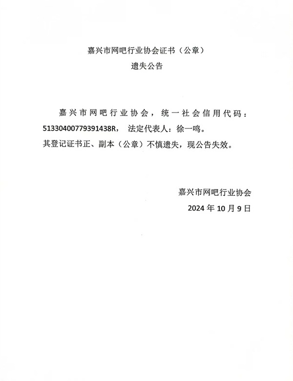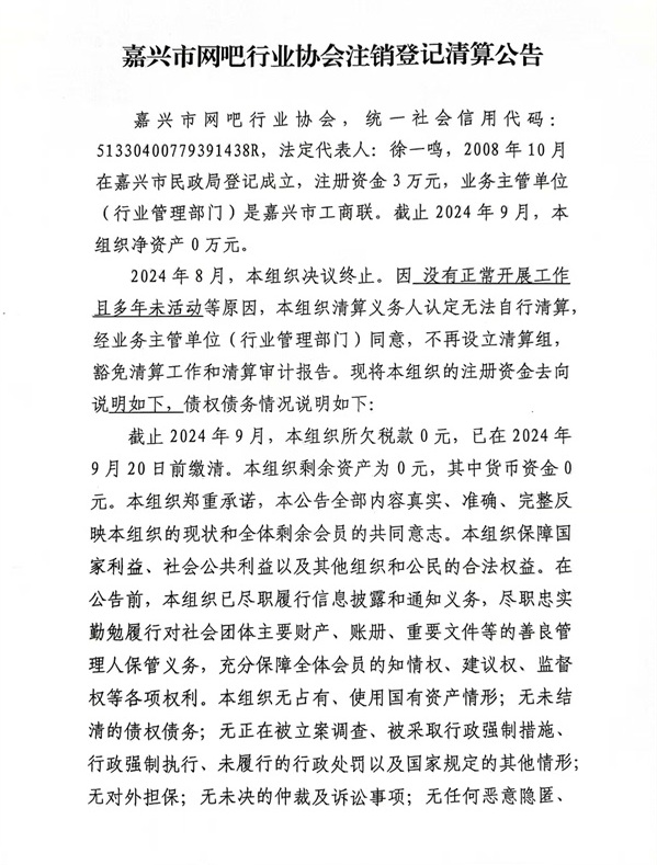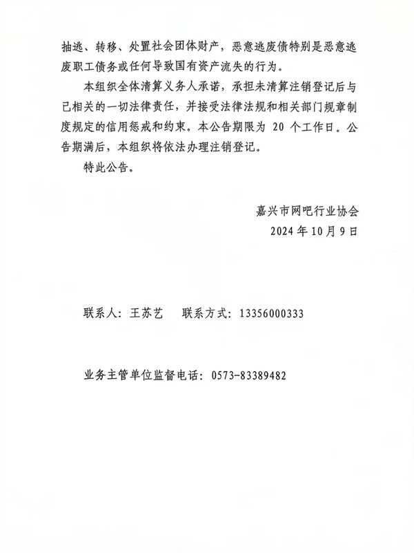 根據《嘉興市民政局關于印發<嘉興市優化社會團體退出機制試點工作方案>的通知》(嘉政民社〔2024〕45號)文件的有關規定,嘉興市網吧行業協會因故無法無法提供清算審計報告,經審查,該協會符合注銷登記簡化清算,由市工商聯代為發布《嘉興市網吧行業協會注銷登記簡化清算公告》,同時代為發布《嘉興市網吧行業協會證書(公章)遺失公告》。公告期為 20 個工作日,自2024年10月10日-2024年11月5日。監督電話:0573-83389482。