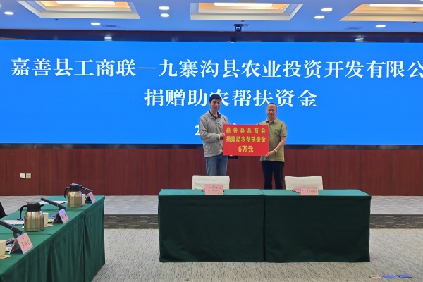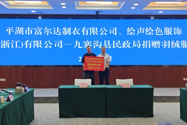 現場舉行了愛心捐贈儀式,嘉善縣總商會向九寨溝縣捐贈助農幫扶資金6萬元。平湖市富爾達制衣有限公司、繪聲繪色服飾(浙江)有限公司共同向九寨溝縣捐贈價值13.5萬元的羽絨服500件。