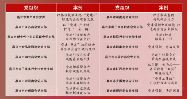 會上,對高忠林等20名“嘉興市工商聯優秀共產黨員”、朱克友等10名“嘉興市工商聯優秀黨務工作者”、嘉興市溫州商會黨委等10個“嘉興市工商聯先進基層黨組織”進行表彰。為嘉興市互聯網行業協會黨支部黨員田力頒發了光榮在黨50年紀念章。商協會黨組織互學互鑒互促工作小組10位組長圍繞走訪情況,以學習教育開展情況和特色亮點工作為重點作交流發言。同時發布嘉興市溫州商會黨委《紅船領航溫商路:“黨建+”賦能商會高質量發展》等綜合類、共富類、公益類、數字類、法治類共16個黨建工作特色案例。