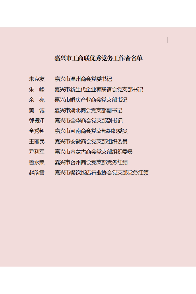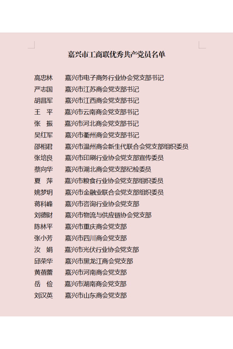 今年是中國共產黨成立104周年,也是“紅船精神”提出20周年。嘉興市工商聯所屬商協會黨組織和廣大黨員堅持以習近平新時代中國特色社會主義思想為指導,深入貫徹習近平總書記考察浙江重要講話精神,聚焦市委總體部署,堅定扛起“經濟大市挑大梁”的責任擔當,深入開展“六干爭先”主題實踐活動,全力以赴推進商協會改革發展和“兩個健康”集成改革,涌現出一大批敢于首創、勤于奮斗、甘于奉獻的先進典型。為大力弘揚“紅船精神”,進一步激勵市工商聯所屬商協會黨組織和廣大黨員牢記囑托、感恩奮進,市工商聯黨委決定,授予高忠林等20名共產黨員“嘉興市工商聯優秀共產黨員”稱號、朱克友等10名黨務工作者“嘉興市工商聯優秀黨務工作者”稱號、嘉興市溫州商會黨委等10個基層黨組織“嘉興市工商聯先進基層黨組織”稱號。